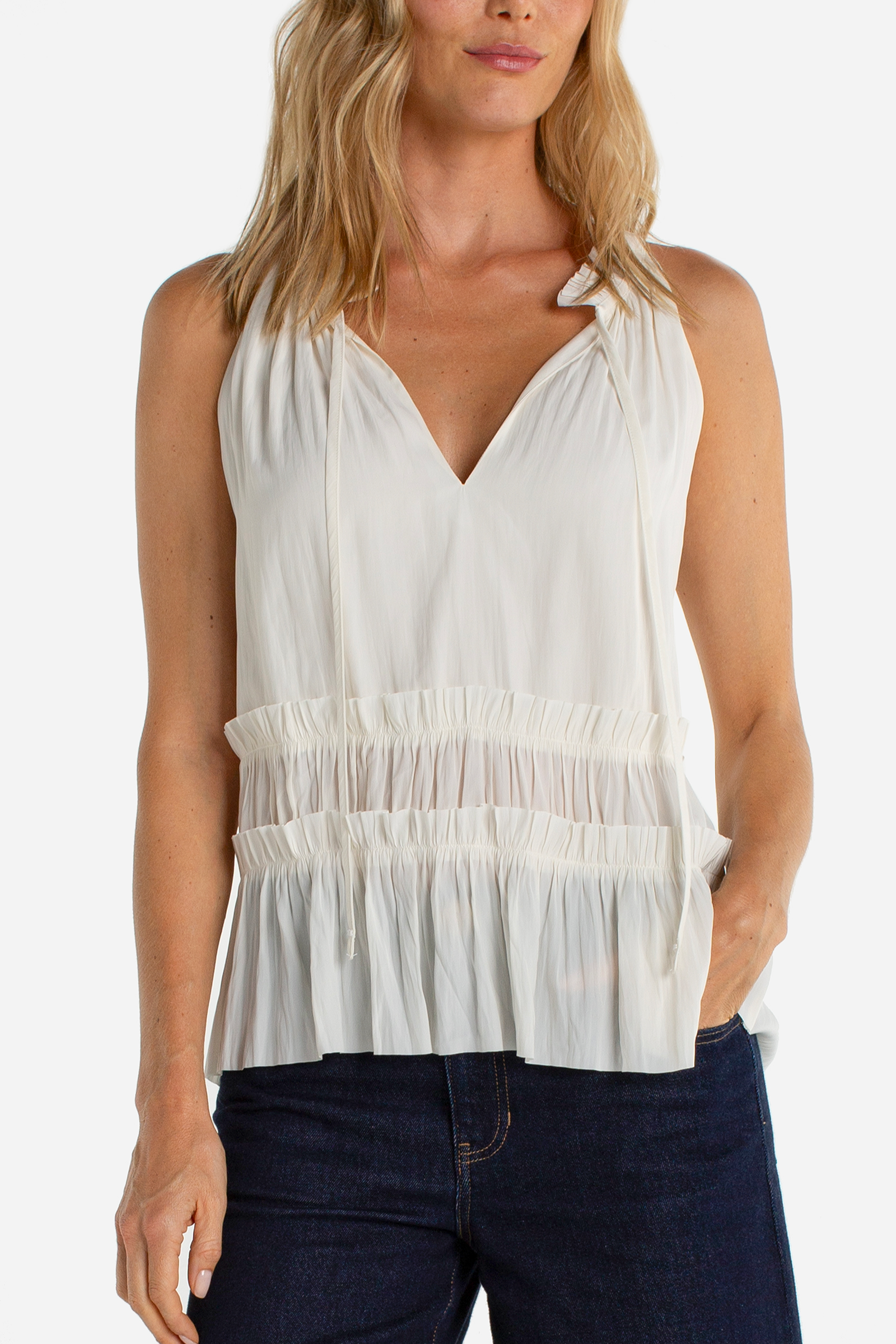 Breezy and feminine, this Sleeveless Woven Top with Ruffles features tiered ruffle detailing and a soft v-neckline for a relaxed, pretty look. The lightweight woven fabric and sleeveless cut make it an ideal warm-weather wardrobe staple. Capsule Collection designed this top to pair effortlessly with jeans or skirts for casual weekend styling.