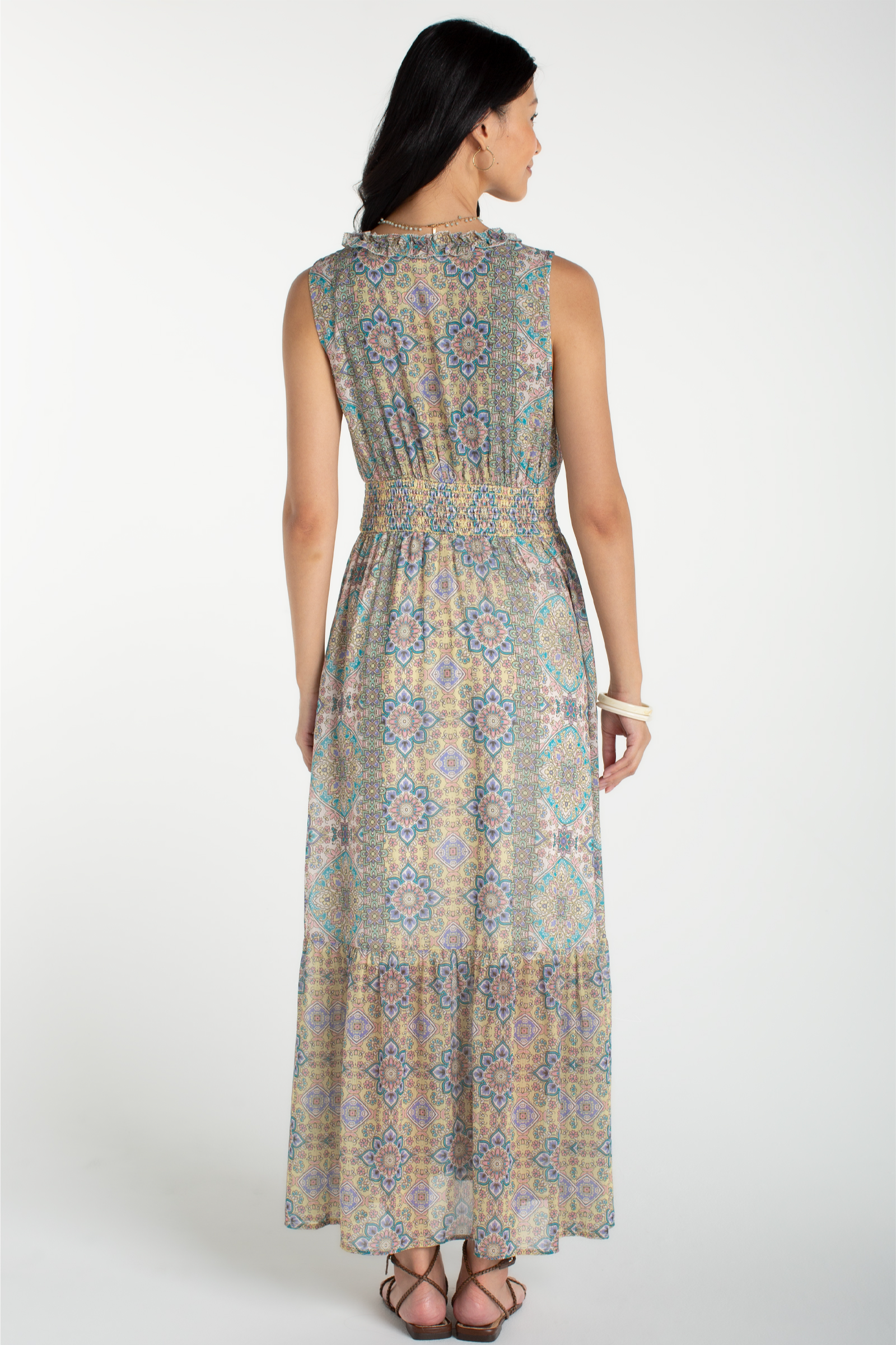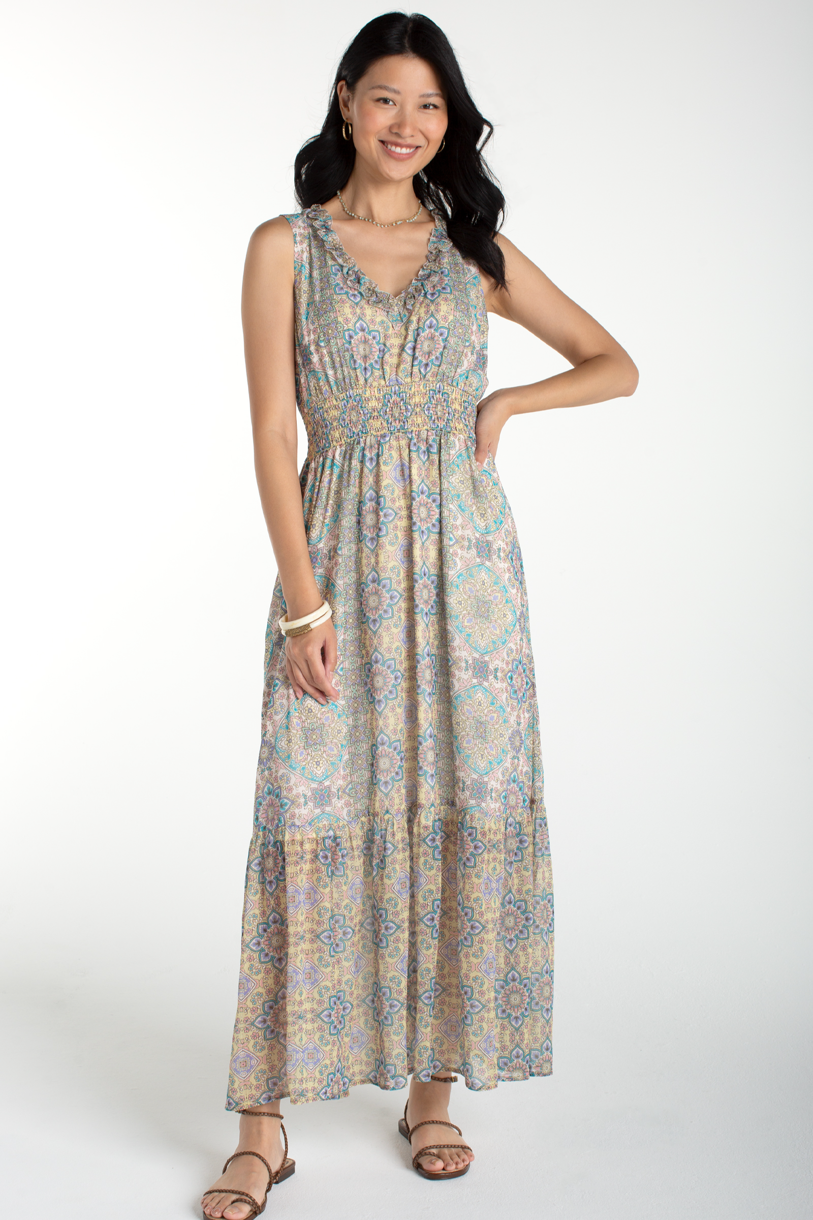 Effortlessly breezy and sun-ready, this Sleeveless Smocked Waist Maxi Dress features a smocked waist and flowing full-length skirt for an easy, flattering silhouette. The sleeveless cut and ruffled V-neck give it a relaxed, bohemian vibe perfect for warm days. Designed by Liverpool Los Angeles, the printed fabric and tiered hem make it an ideal pick for casual outings or vacation packing. Pair it with sandals for a laid-back look or dress it up with layered jewelry.