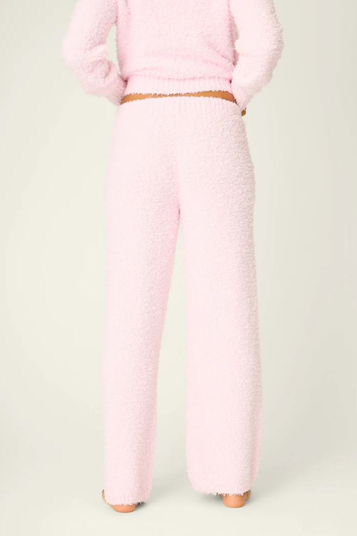 Soft boucle lounge pants with an open, wide leg silhouette designed for relaxed days at home. The Bundle Up Boucle Pink Open Leg Pants feature a fuzzy texture and drawstring waist for a cozy, comfortable fit, side pockets. PJ Salvage crafted these in a plush knit that pairs perfectly with the matching top or layered over pajamas. Wear them for lounging, low-key errands, or chilly evenings in. Machine Wash Cold. Do Not Bleach. Tumble Dry Low.