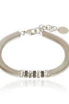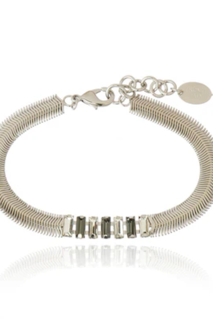 Made in Italy Bronze Metal Baguette-cut Crystals Rhodium Plated A playful bracelet that easily can be part of your everyday risk stack! Take cues from the crystal palette when choosing the rest of your jewelry. Bracelet Length, 7" + 2" Extension