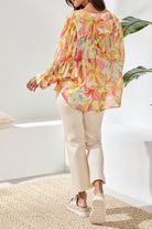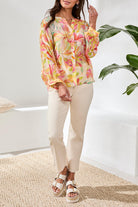This lightweight, flowy dolman sleeve blouse features self-covering buttons and a relaxed silhouette for effortless layering. The Flowy Dolman Sleeve Blouse with Self-Covering Buttons from Tribal Fashion is cut from a semi-sheer woven with a colorful botanical print, offering breezy movement. Dolman long sleeves and a subtle split V-neckline give it a casual, vacation-ready feel that pairs well with jeans or linen pants. Wear it for weekend errands or resort days when you want an easy, polished look.