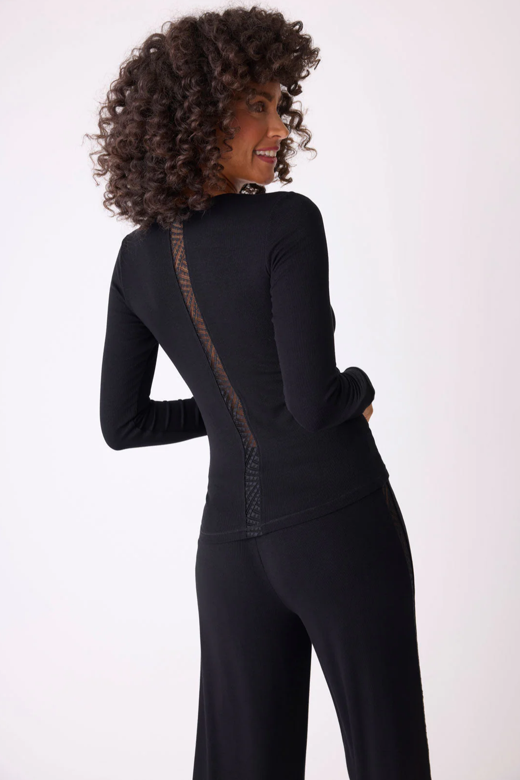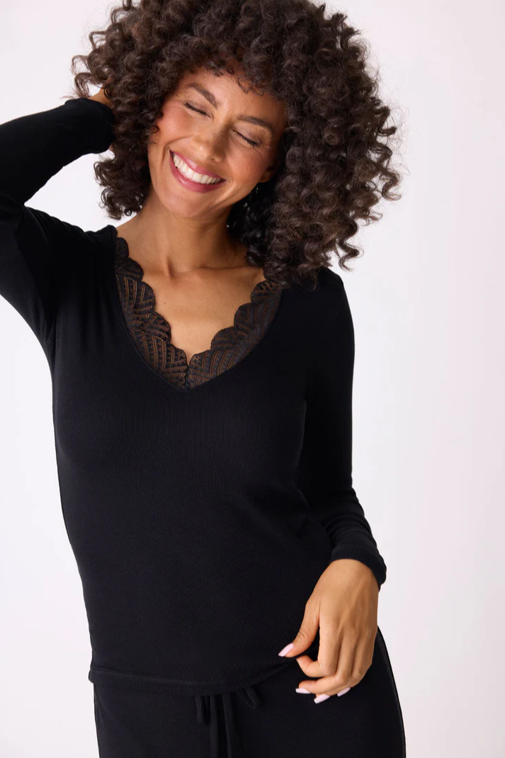 A soft long-sleeve top with delicate lace trim framing a flattering V-neckline, perfect for relaxed everyday wear. The Lacey Basics Long Sleeve Top pairs a ribbed knit silhouette with scalloped lace detailing for a subtly romantic look. The micro-rib knit fabric offers a soft, cozy feel, while the lace inset neckline and back detail add a touch of sophistication. Machine Wash Cold. Do Not Bleach. Tumble Dry Low.