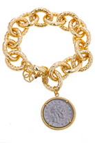 Large hammered round links make up the Lexi bracelet complete with a single lira coin charm. Can be used with day and night looks. Match it with the Lexi Hammered Necklace for a complete look! Length: 8 in. with 1 in" extender