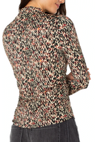 This statement knit is designed with a mock neck, subtle shirring, and an eye-catching geo ikat print that adds movement and depth. With just the right amount of stretch and a flattering drape, it’s an effortless way to elevate denim, trousers, or layered looks.