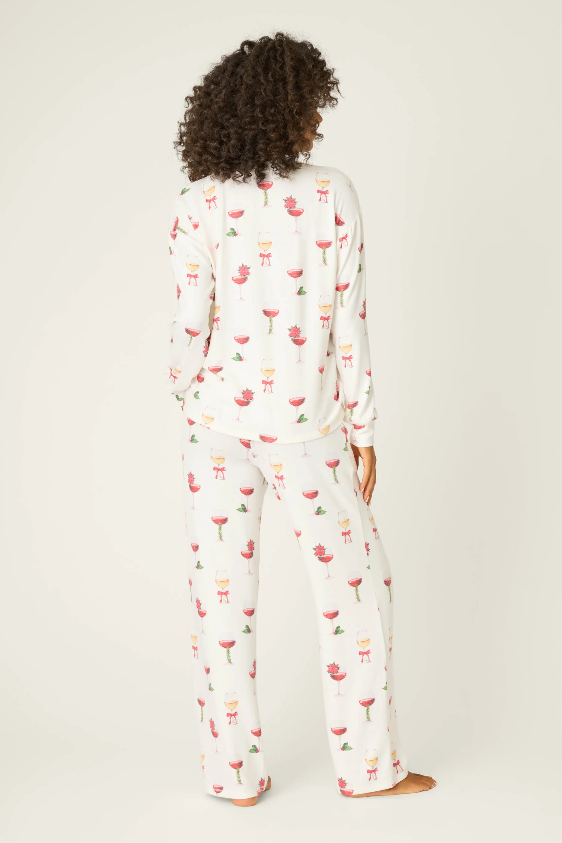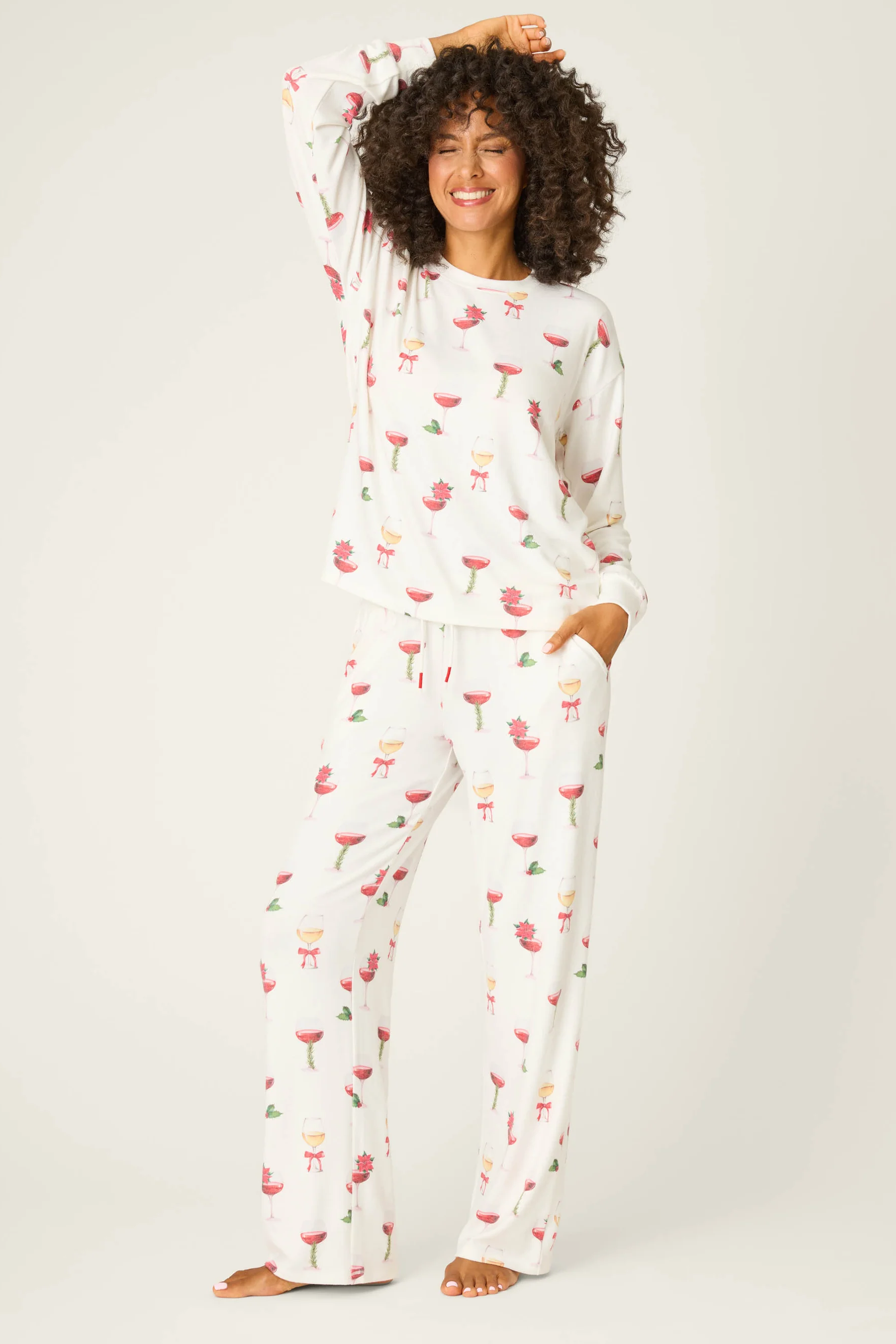 Raise a toast to cozy season in this ivory pajama pant, scattered with festive champagne glasses. Cut in our peachy jersey, relaxed straight-leg pant with a drawstring waist—an instant holiday favorite for cozy nights in and festive mornings alike. Pair with our tank or long sleeve top. Turn Garment Inside Out. Machine Wash Cold. Do Not Bleach. Lay Flat to Dry.
