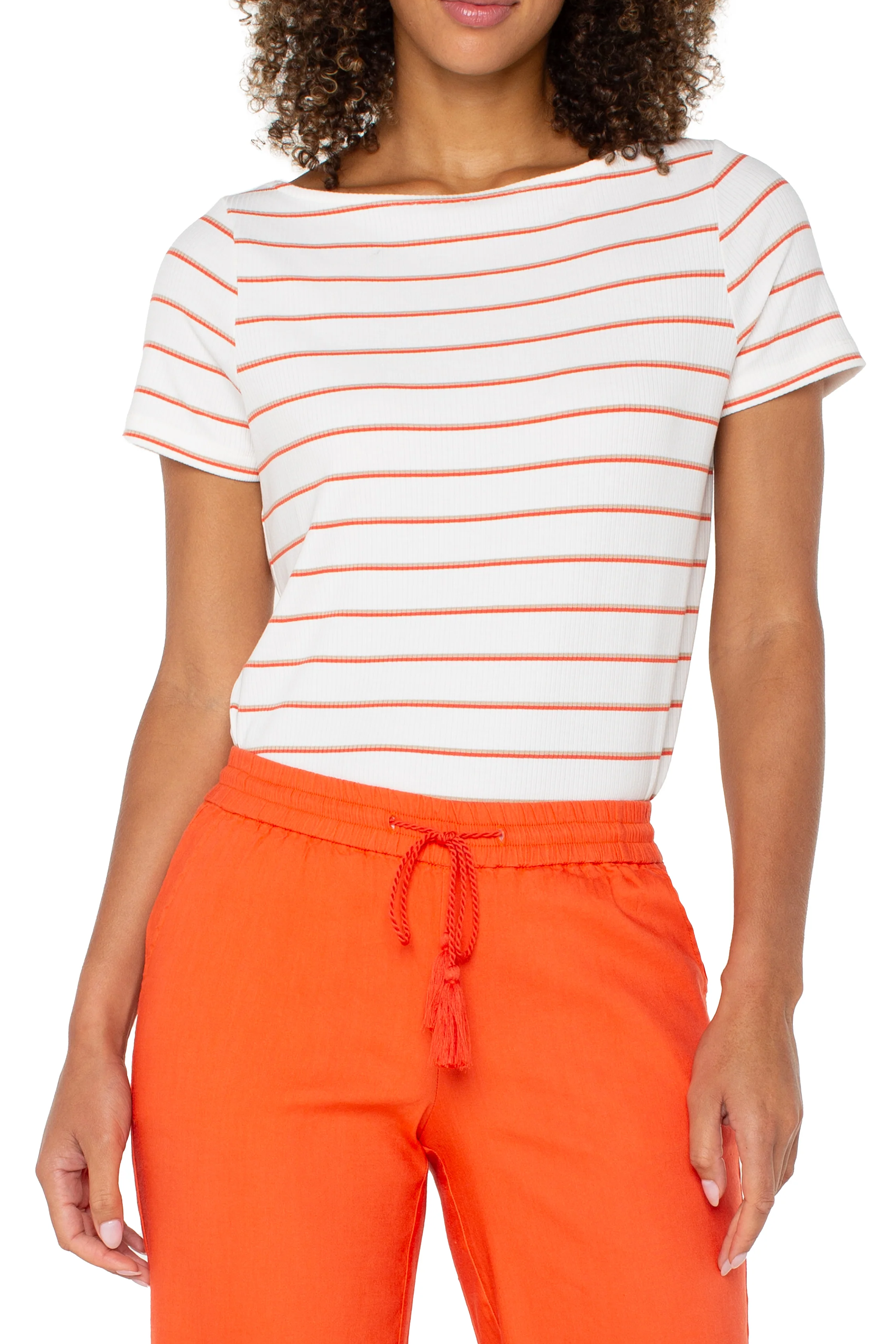 This short-sleeved boatneck knit top showcases a striped design in a stunning clementine hue. It's ideal for complementing denim in a casual yet chic ensemble.