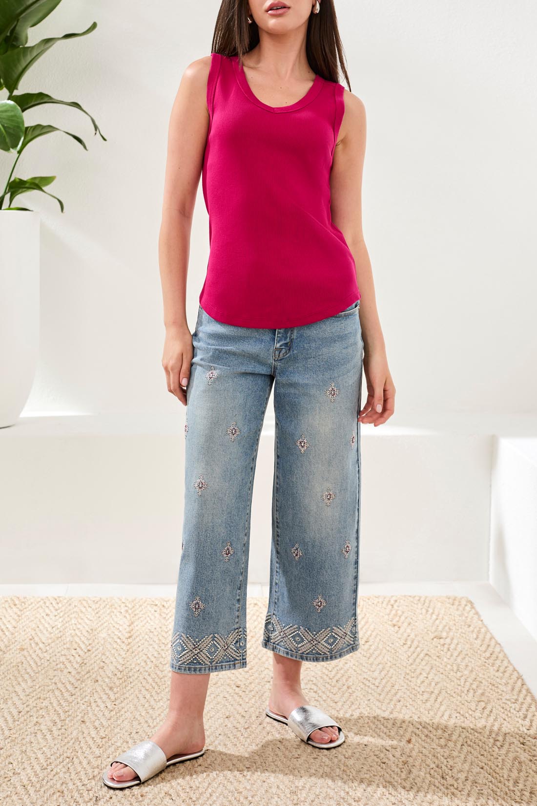 The Wear 2 Ways Tank Top is a versatile ribbed tank with a flattering V-neck and sleeveless cut that can be styled multiple ways. Tribal Fashion designed this piece for easy everyday wear and warm-weather layering. The slim, slightly fitted silhouette and soft knit fabric give it a polished-casual look suitable for errands or vacation outfits. Tuck it into jeans or wear it untucked for a relaxed, modern vibe.