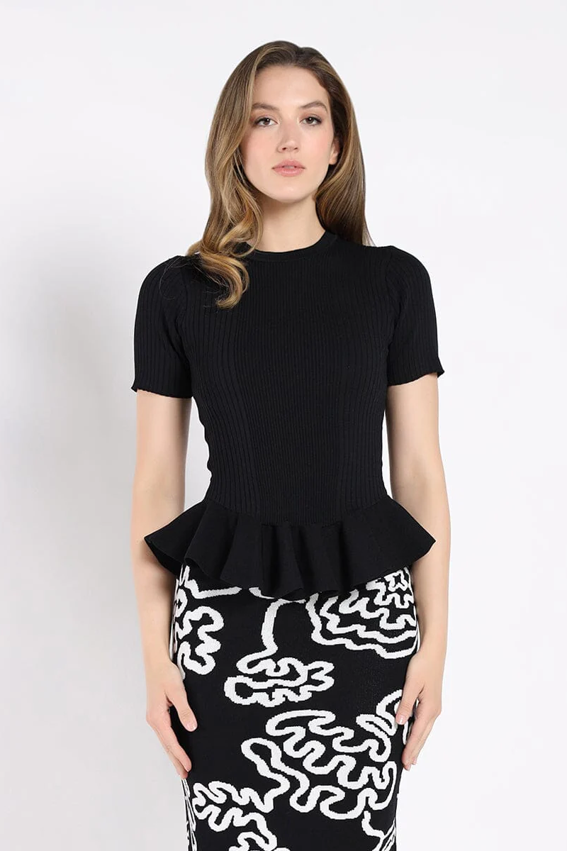 Fitted Knit Short Sleeve Crew Neck Peplum Top