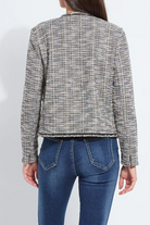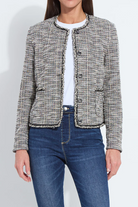 Stretch Tweed Jacquard, features front pockets, sleeve slits for easy cuffing, shiny gunmetal buttons and tasteful fringe detailing. Half lined inside with Stretch Satin and true to size, the Charlotte Collarless St Tweed Jacket is as chic as it is comfortable.