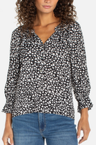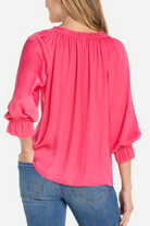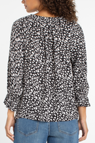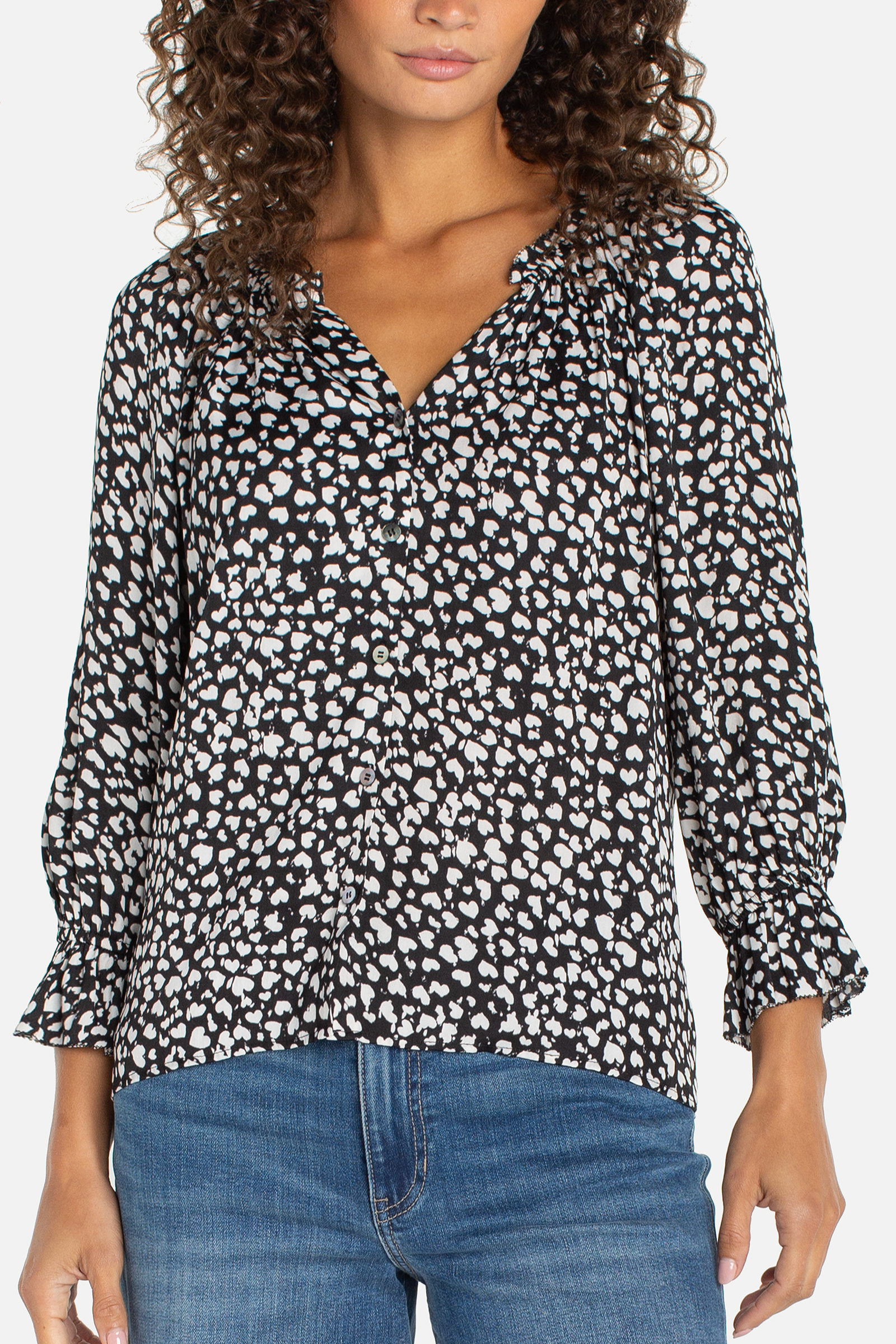 3/4 Sleeve Button Front Woven Top with Ruffle Details