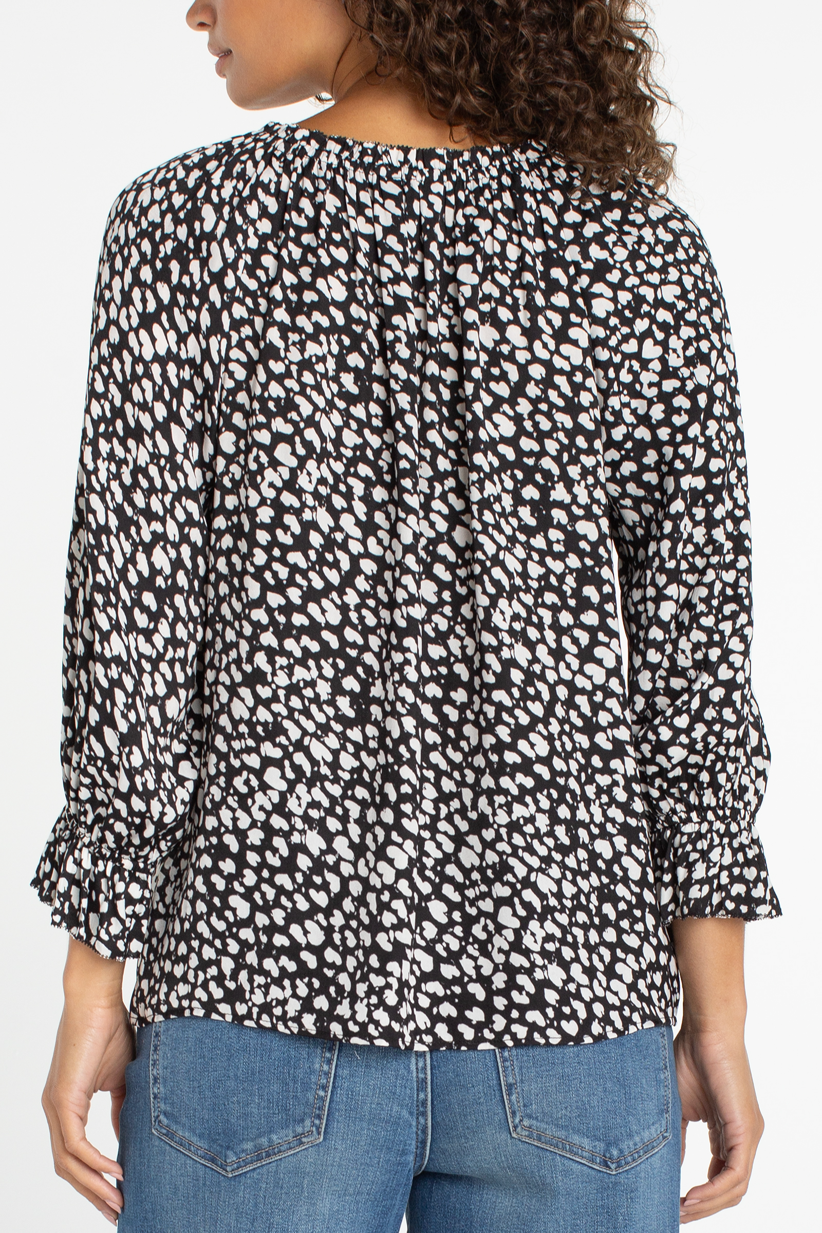 This 3/4 Sleeve Button Front Woven Top with Ruffle Details is a breezy button-front blouse with soft gathers at the neckline and ruffle trim. The Capsule Collection top is crafted in a lightweight woven fabric with billowy three-quarter sleeves and elasticized cuffs for subtle volume. Pair it with jeans or tailored pants for an easy everyday or office-ready look.