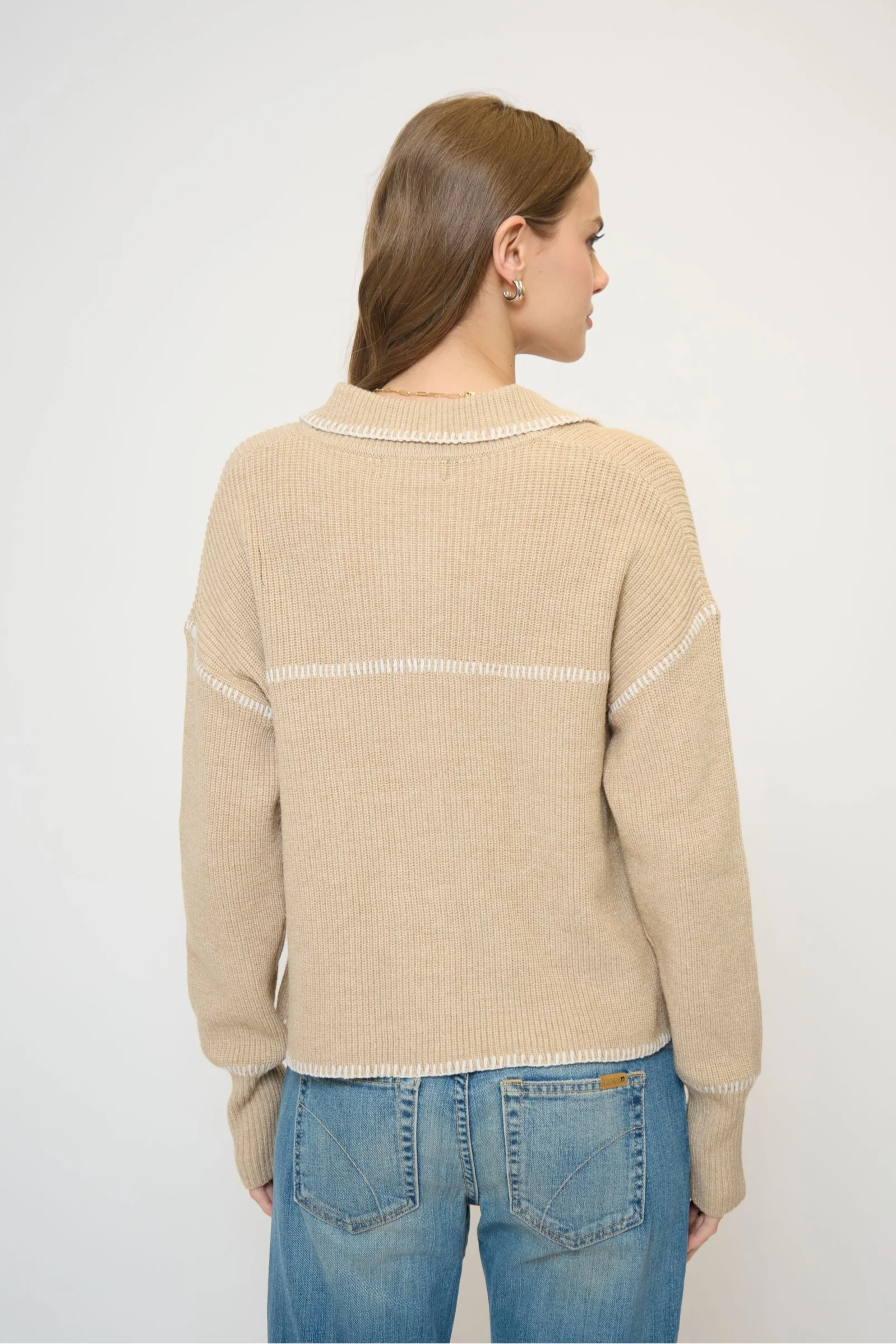 A cozy beige button-front knit cardigan with a relaxed silhouette and ribbed long sleeves. The Button Front Knit Cardigan features a collared neckline, large patch pockets, and contrast stitch detailing for a casual, lived-in look. Made from a soft sweater knit, it layers effortlessly over tees or lightweight tops for everyday wear.