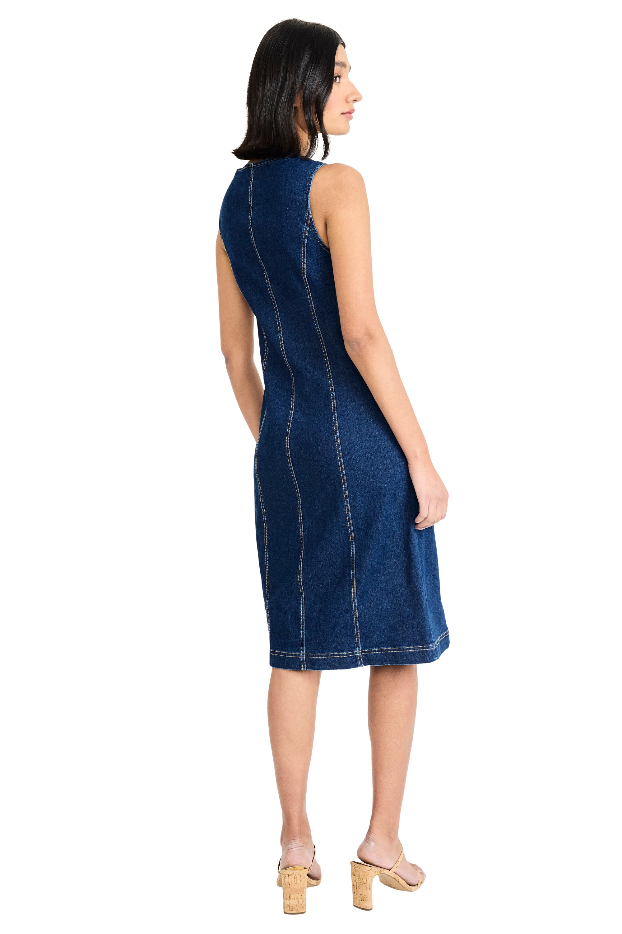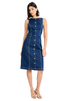 The Natalie Stretch Denim Shirt Dress is a midi-length shirt dress cut from stretch denim for comfortable wear. Maggy London designed this sleeveless silhouette with a button front and belted waist for a flattering, classic fit. The denim fabric and shirtdress styling make it a polished option for casual days and vacation looks. Pair it with sandals or espadrilles for a relaxed yet refined ensemble.