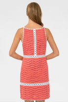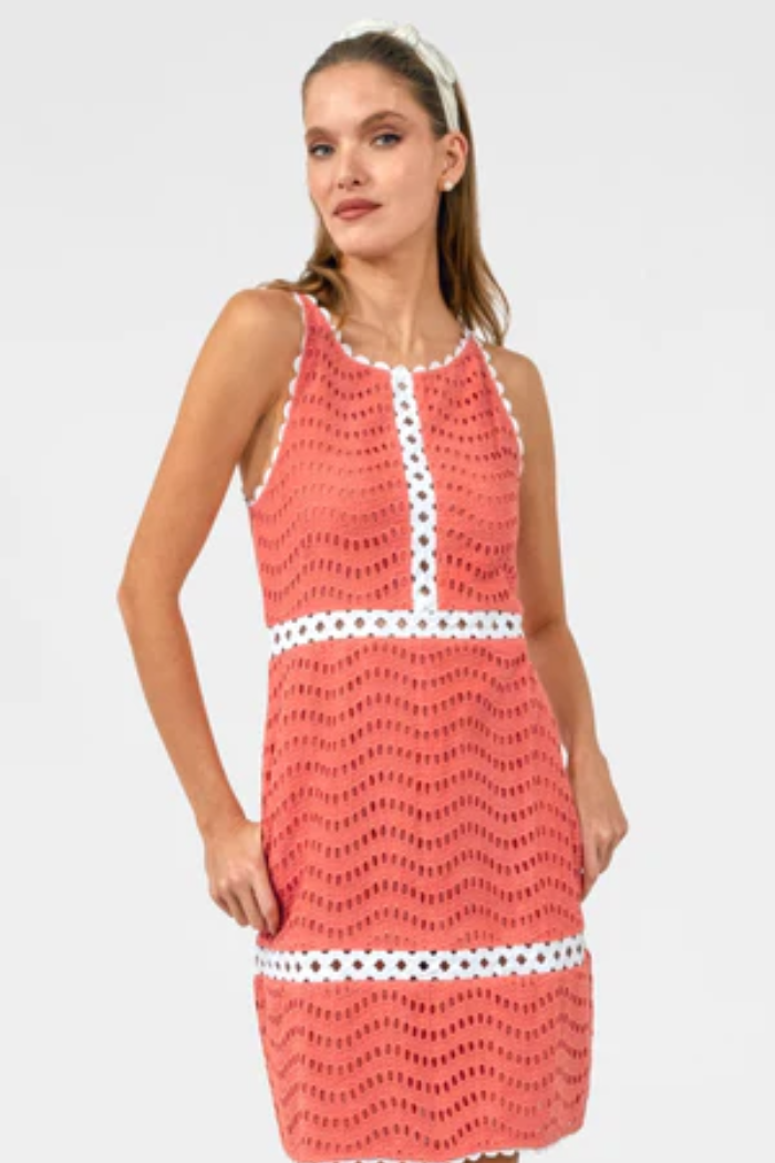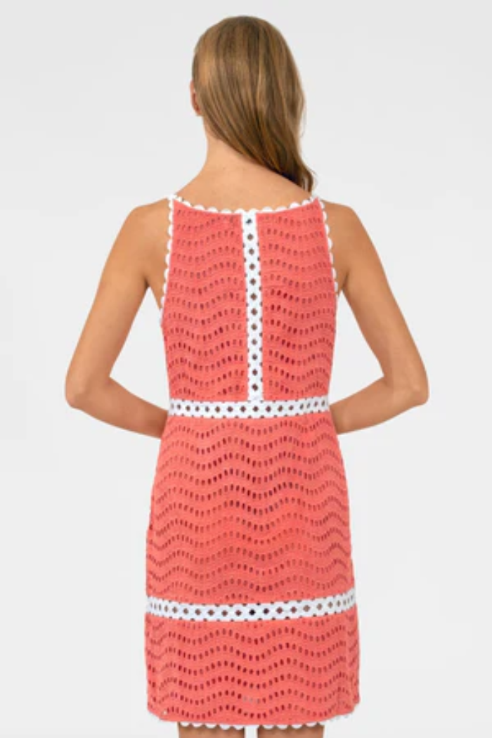 The Rikki Eyelet Dress is a sleeveless eyelet sheath that balances polished tailoring with breezy detailing. Lightweight eyelet fabric and scalloped trims give it a fresh, warm-weather feel. The silhouette falls to the knee for a refined yet easy look that works for daytime events or vacation outings. This dress is from Gretchen Scott and pairs well with sandals or a lightweight blazer for transitional styling.