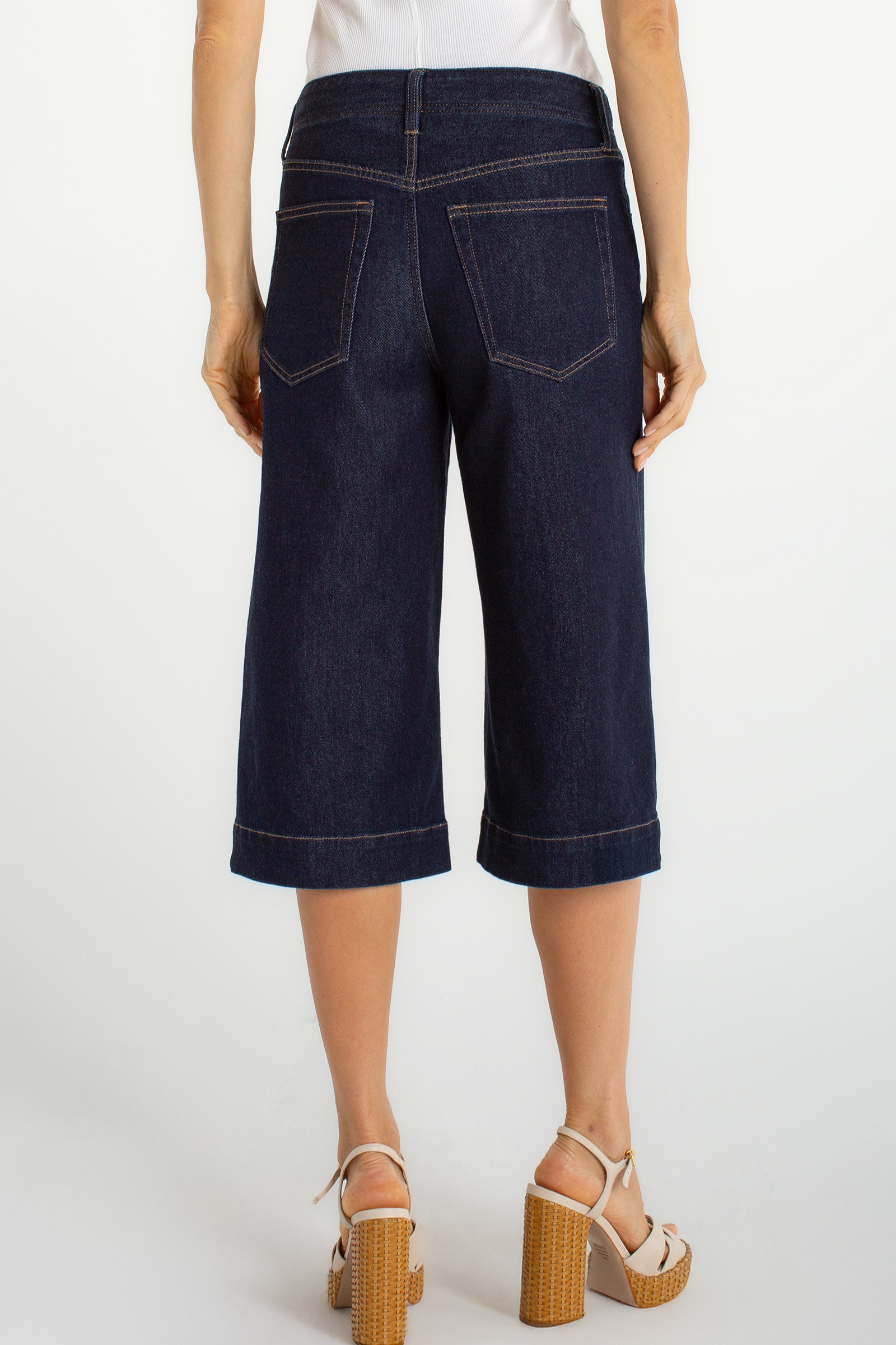 A cropped wide-leg denim pant with an 18.5-inch inseam that reads like an easygoing culotte. The Sailing Denim Pant features dark indigo denim, a high-mid waist with belt loops and a gold button closure, and a roomy cropped silhouette that hits mid-calf. Liverpool Los Angeles designed this pair for relaxed, nautical-tinged styling that pairs equally well with tees or sandals.