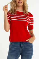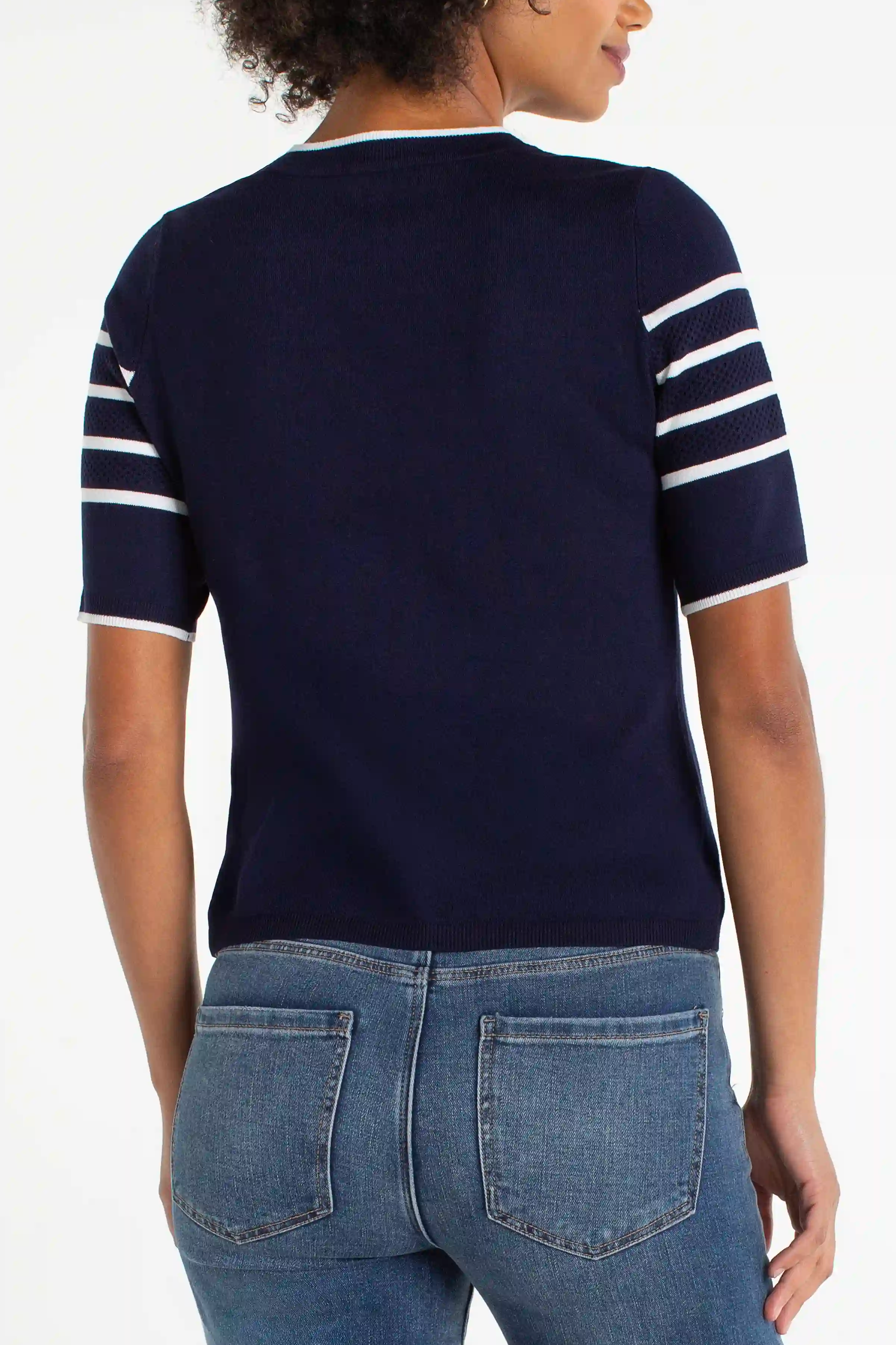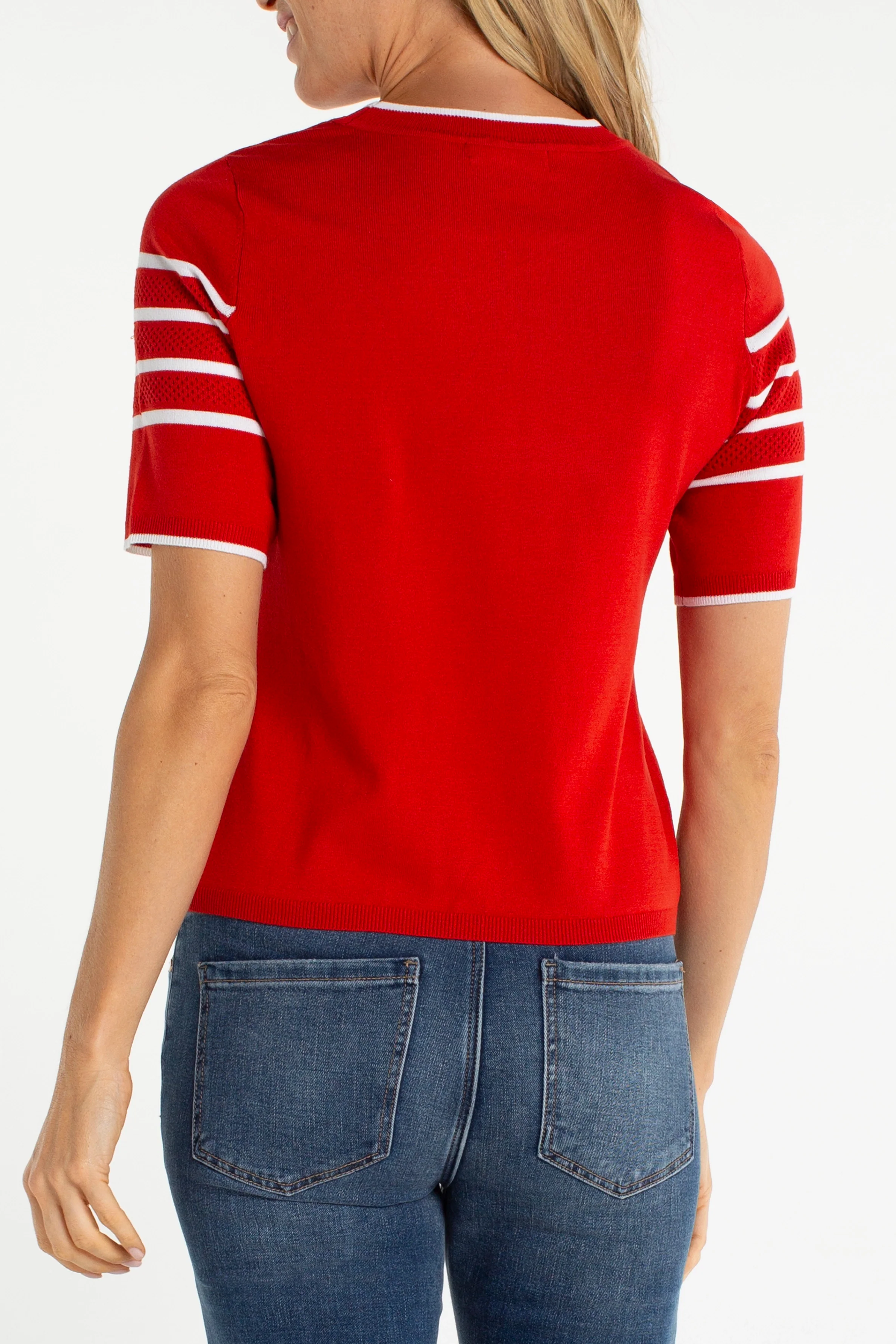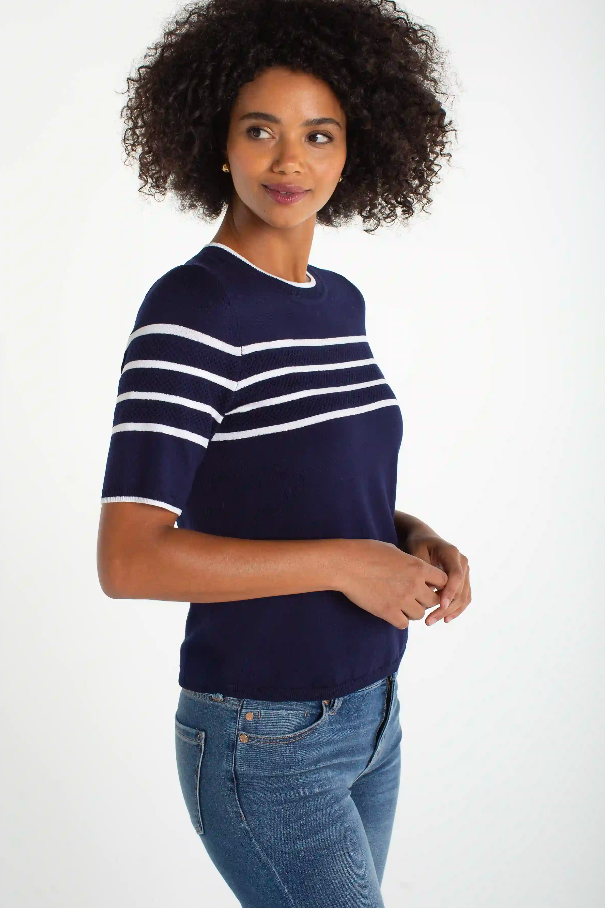 The contrast stripe detail adds a subtle graphic touch while ribbed finishes create a clean, tailored shape. Lightweight and versatile, this short sleeve crew is the kind of knit that elevates every outfit with minimal effort.