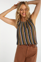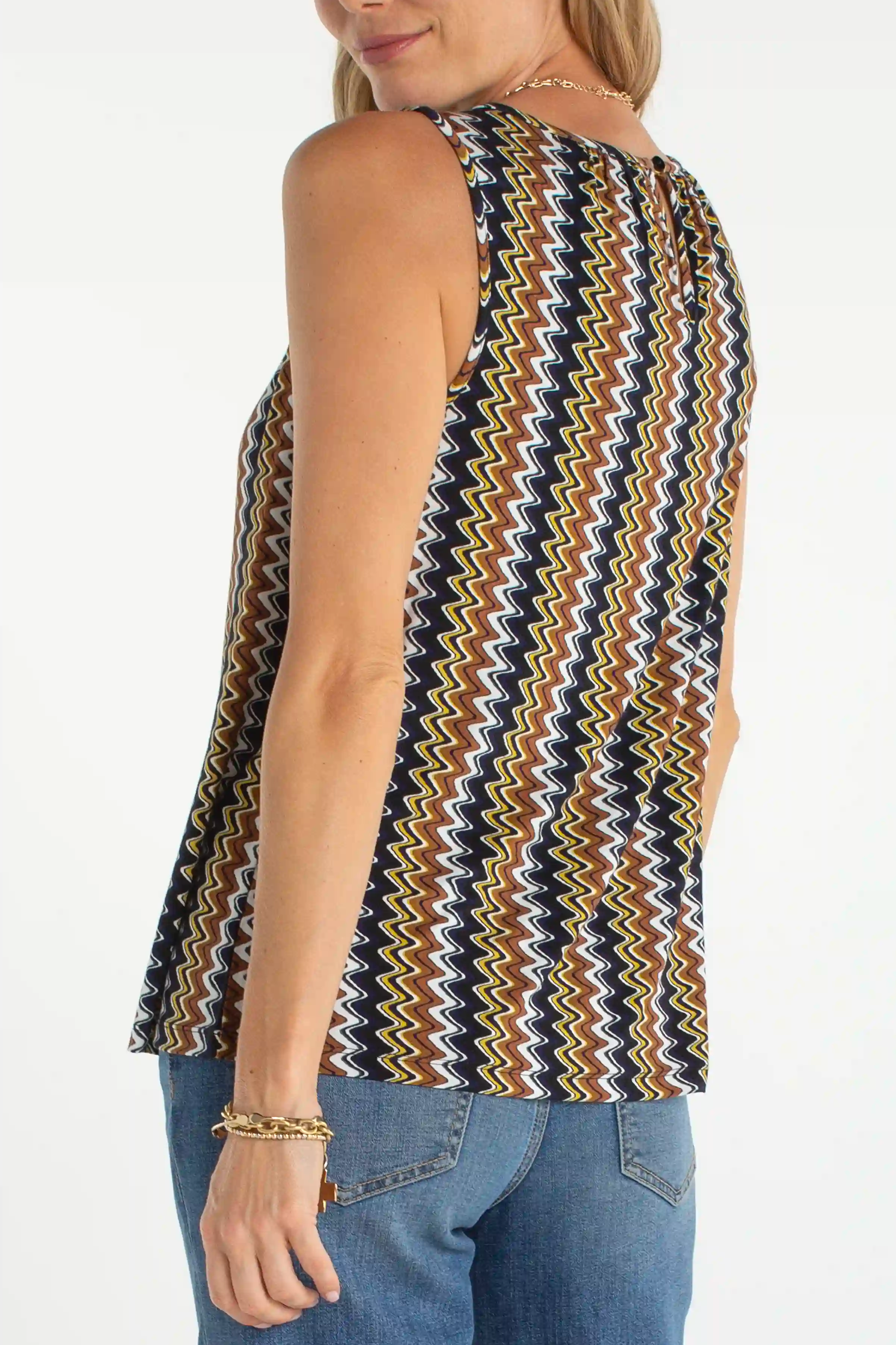 This sleeveless A-line silhouette is finished with soft shirring at the neckline that creates a graceful drape from every angle. The keyhole opening at the back adds a subtle touch of sophistication. Designed in a refined Black Navy Gold stripe that feels modern and elevated.
