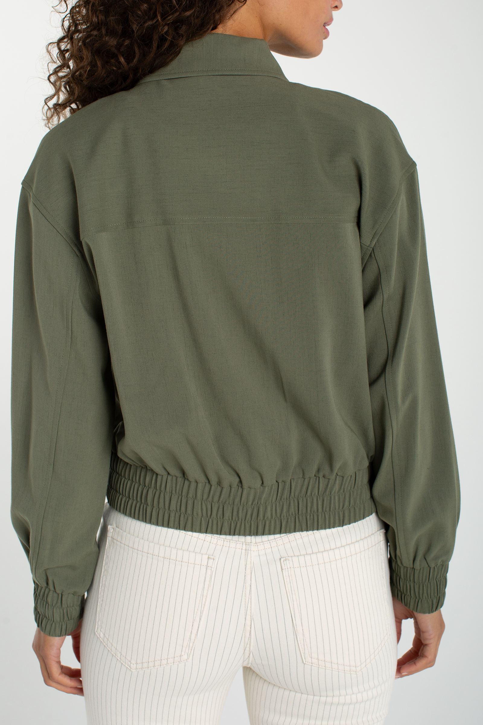 This Zip Front Jacket is a cropped, collared jacket with a front zipper and elasticized hem and cuffs for a relaxed, modern shape. The olive-green piece features button-flap chest pockets and a boxy bomber silhouette ideal for layering. Liverpool Los Angeles designed it to give casual outfits an elevated, utilitarian touch.