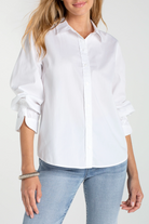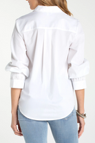 The elastic cuff lets you scrunch the sleeves for an effortless, lived in feel that holds its shape. Finished with a clean button front for a look. 27" High Shoulder Point