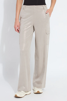 Made from 4-way stretch, easy-care fabric, the Callie Patent Foil Vegan Suede Cargo Pant are relaxed and slouchy. Detailing includes low-placed side pockets for a slimmer silhouette, a raw-edge hem for simple alterations and a wide leg. The Callie Patent Foil Vegan Suede Cargo Pant also offers a clean front, belt loops, patch pockets, a back yoke and waist seam, and a concealed patented waistband. Lyssé concealed patented 360° smoothing waistband