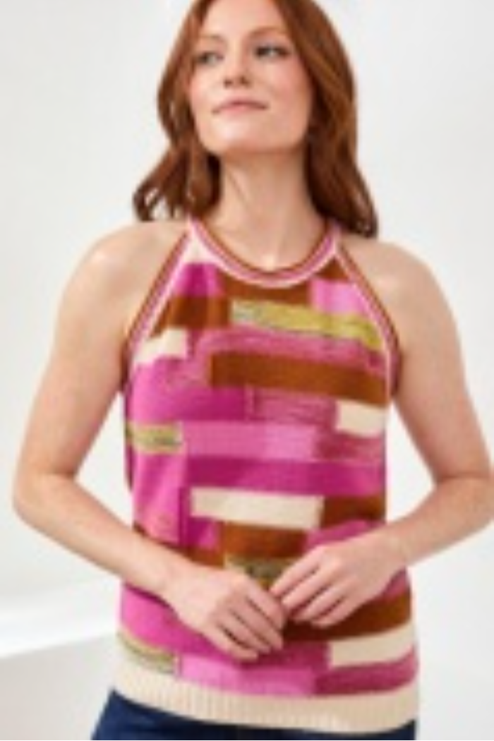 This knitted patchwork halter is a sleeveless knit top with vibrant color blocks and a ribbed hem for a relaxed, contemporary look. The Knitted Patchwork Halter from Tribal Fashion features a halter neckline and lightweight sweater knit ideal for warm-weather layering or vacation packing. Pair it with high-waist jeans or a skirt for an easy casual outfit that reads modern and playful.