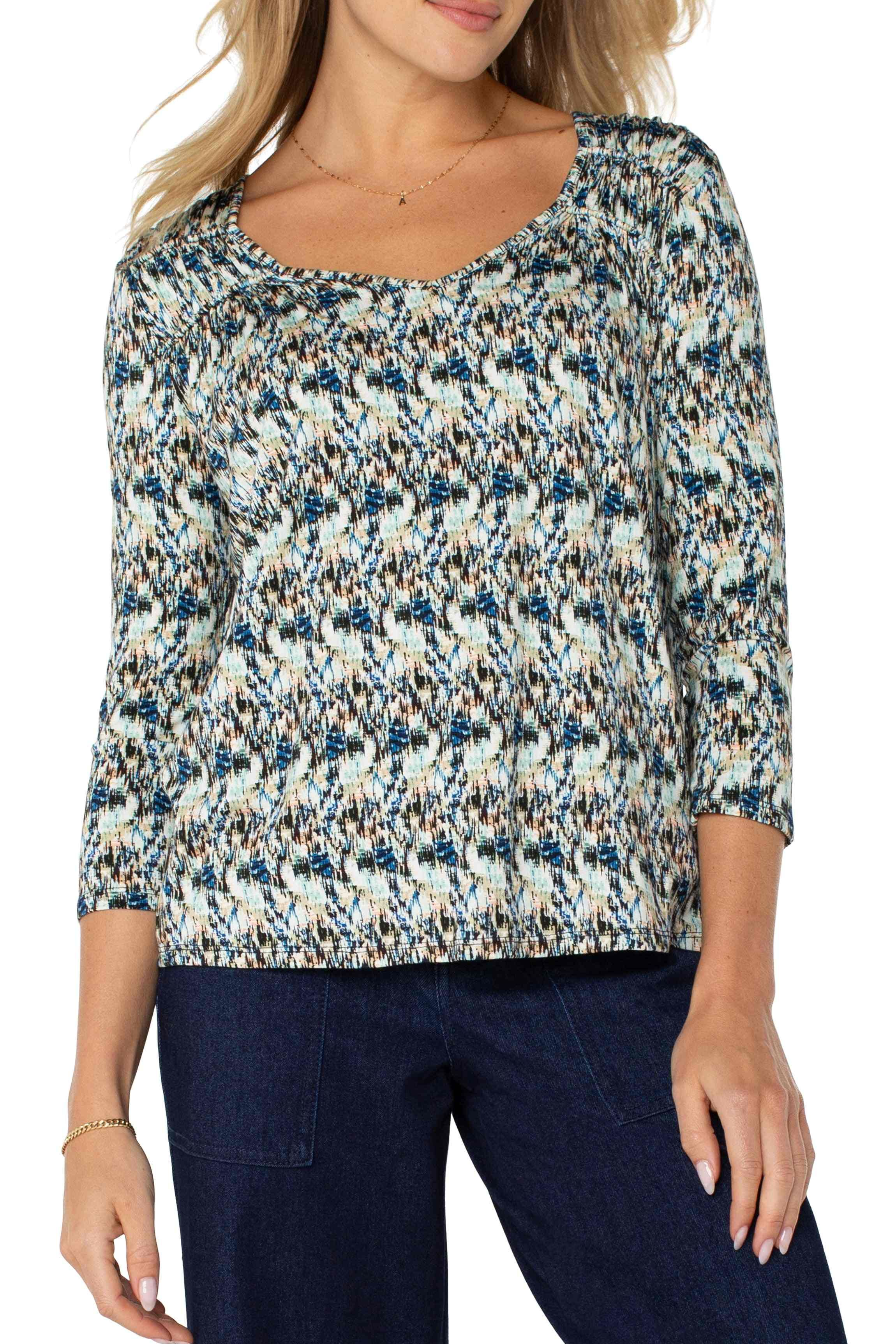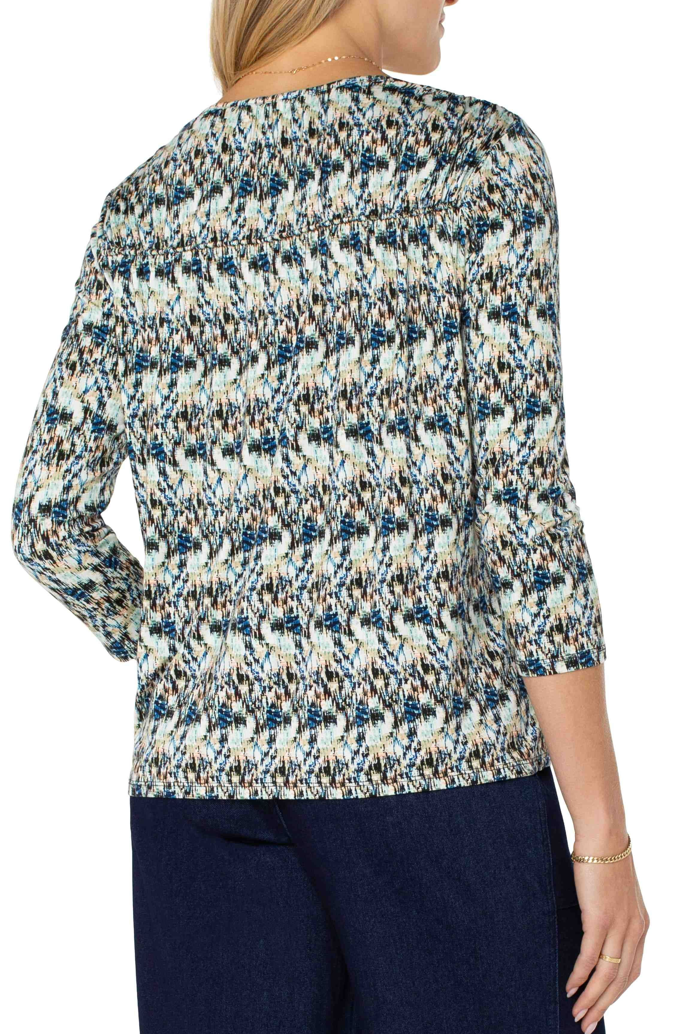 This long sleeve knit top provides both comfort and breathability with a beautiful drape. The shirred detailing and relaxed knit make it versatile for day-to-night wear without sacrificing ease of movement.