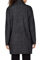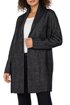 The open-front silhouette is finished with a shawl collar, and practical seam pockets—balancing sophistication with ease.