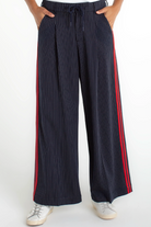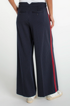 A modern trouser with a refined athletic edge. This high rise wide leg silhouette features soft pleating that creates beautiful movement, contrasted with a clean side stripe that elongates the leg. Tailored pocket details and a functional drawcord give it a relaxed yet dressed-up versatility that works from weekday to weekend.