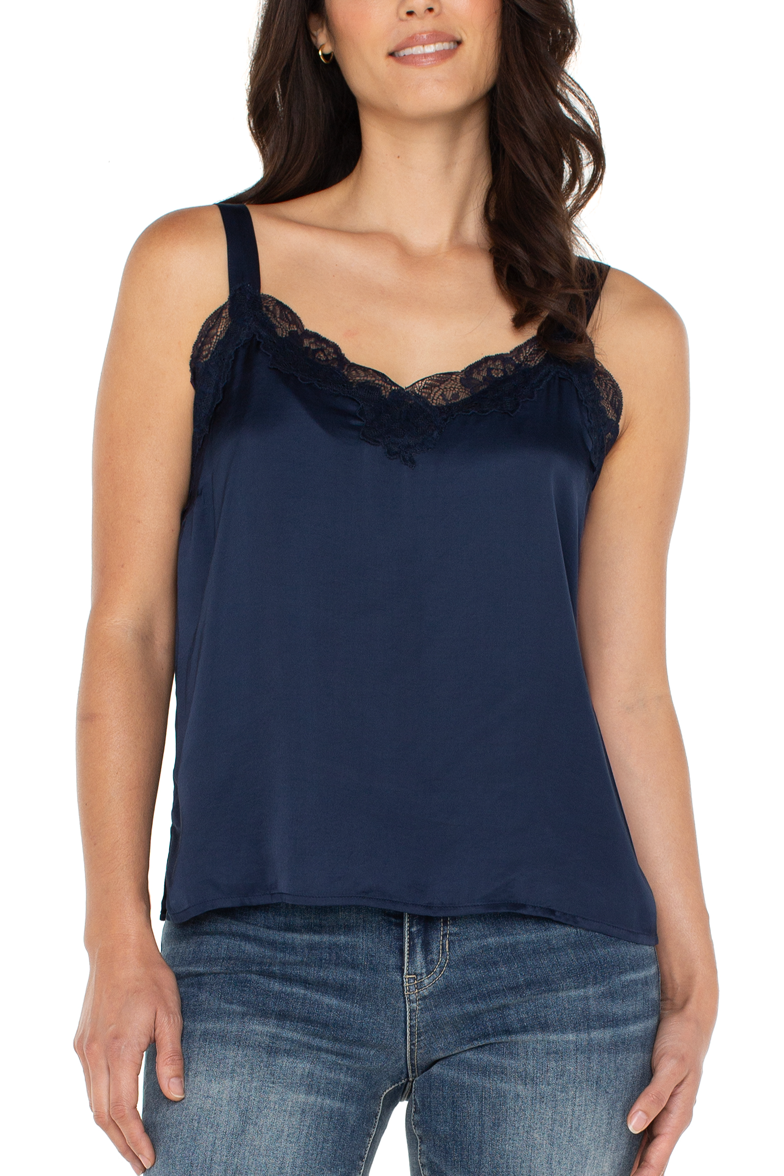 This woven tank features a soft V-neckline framed by delicate lace trim, adjustable straps, and a breezy, sleeveless silhouette. Perfect for layering or wearing solo with effortless ease.
